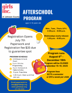If you have any questions or would like to know more about any of our after-school program offerings, please contact Girls Inc.’s Office Manager, Amy Chandler, at amy@girlsincjc.org or 317-736-5344.